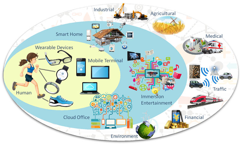 面對以上的應用需求,4G難以滿足,這就讓我們把期望寄托在新一代移動通信系統,即5G。5G的目標是通過自身能力的拓展成為新一代信息基礎設施,通過萬物互聯,如圖1所示,賦能社會各行各業,促進社會的信息化和數字化發展,提升經濟發展的效率和質量,提升社會運行和治理的效率。