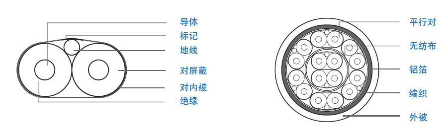 | 對屏蔽:鋁箔麥拉帶, 鋁面朝內(nèi),顏色 - 藍(lán) | 外被 |
